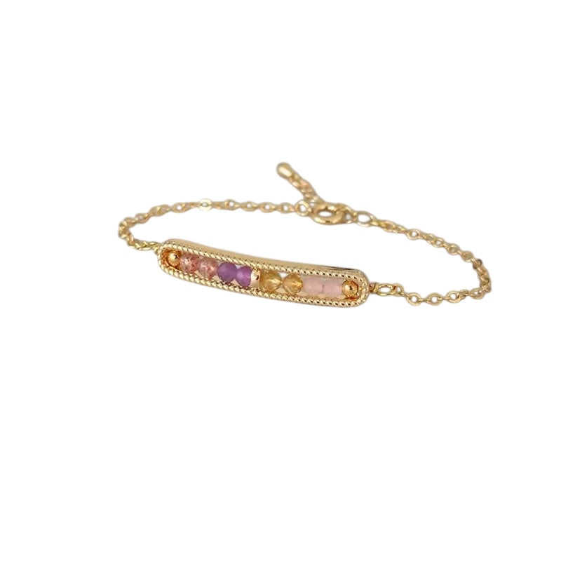 Experience vibrant healing energy with our "Bar of Brilliance" bracelet! This beautiful bracelet features a stunning array of faceted gemstone beads place in a stainless steel display bar. Dainty and easy to wear, this piece provides intentional healing with a touch of luxury and sophistication. Size: Adjustable with extender Bracelet Styles Include: "It's All Love" - Rose Quartz, Pink Tourmaline, Orange Garnet, Red Garnet "Stress Be Gone" - Moonstone, Lapis Lazuli, Tanzanite, Aquamarine "Just Relax" - Sapphire, Aquamarine, Clear Quartz, Smoky Quartz "Emotional Healing" - Strawberry Quartz, Amethyst, Citrine, Rose Quartz "Money On My Mind" - Green Aventurine, Citrine, Orange Garnet, Peridot "No Bad Vibes" - Black Tourmaline, Clear Quartz, Smoky Quartz, Hematite "Trusting My Intuition" - Lapis Lazuli, Clear Quartz, Labradorite, Moonstone "Baby Fever" - Aquamarine, Rose Quartz, Amazonite, Moonstone "Spiritual AF' - Clear Quartz, Amazonite, Blue Apatite, Sapphire "Goodbye Anxiety" - Amethyst, Howlite, Clear Quartz, Blue Apatite
