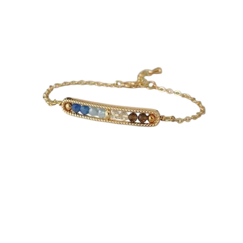 Experience vibrant healing energy with our "Bar of Brilliance" bracelet! This beautiful bracelet features a stunning array of faceted gemstone beads place in a stainless steel display bar. Dainty and easy to wear, this piece provides intentional healing with a touch of luxury and sophistication. Size: Adjustable with extender Bracelet Styles Include: "It's All Love" - Rose Quartz, Pink Tourmaline, Orange Garnet, Red Garnet "Stress Be Gone" - Moonstone, Lapis Lazuli, Tanzanite, Aquamarine "Just Relax" - Sapphire, Aquamarine, Clear Quartz, Smoky Quartz "Emotional Healing" - Strawberry Quartz, Amethyst, Citrine, Rose Quartz "Money On My Mind" - Green Aventurine, Citrine, Orange Garnet, Peridot "No Bad Vibes" - Black Tourmaline, Clear Quartz, Smoky Quartz, Hematite "Trusting My Intuition" - Lapis Lazuli, Clear Quartz, Labradorite, Moonstone "Baby Fever" - Aquamarine, Rose Quartz, Amazonite, Moonstone "Spiritual AF' - Clear Quartz, Amazonite, Blue Apatite, Sapphire "Goodbye Anxiety" - Amethyst, Howlite, Clear Quartz, Blue Apatite