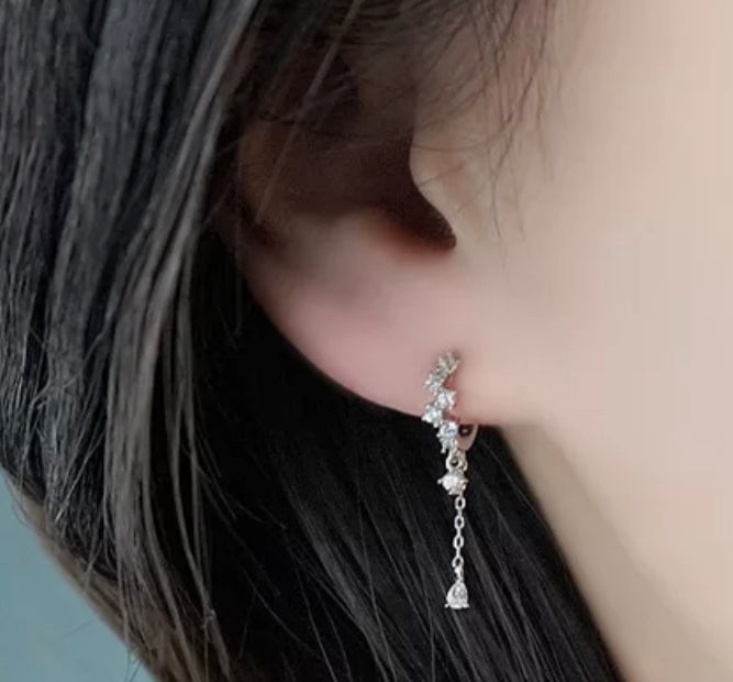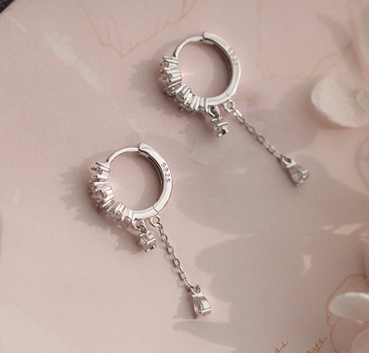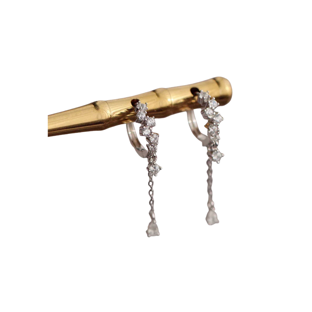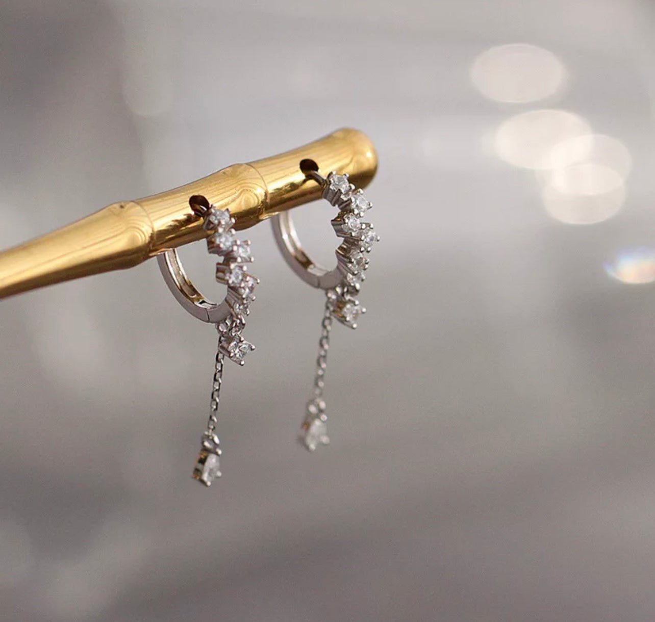 A Scattered cubic zirconia huggie with a delicate drop and a pear stone dangling.