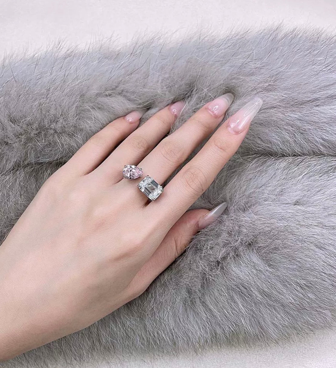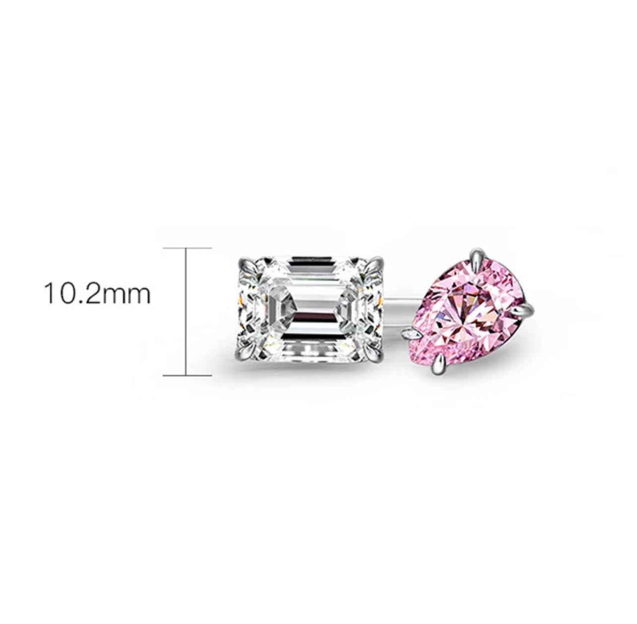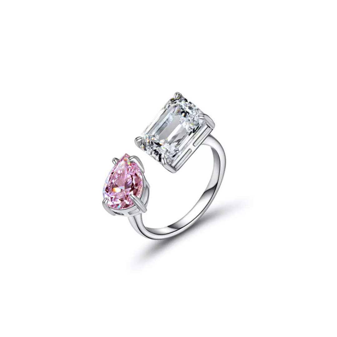 The Ring of the Season. An open design with 2 Magnificent NSCD & Lab Sapphire Stones on either side. A Pink Pear Lab Sapphire & An Emerald Cut combine to reflect light and sparkle like never seen before. 6 week lead time to source stones. Open size