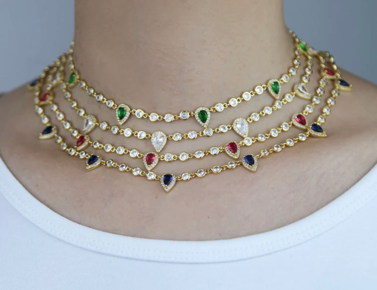Beautifully designed and crafted Pear & Brilliant Cubic Zirconia with Cherry Red Accents. This Necklace has a bezel set tennis design with Pear Cubic Zirconia surrounded by a delicate halo.