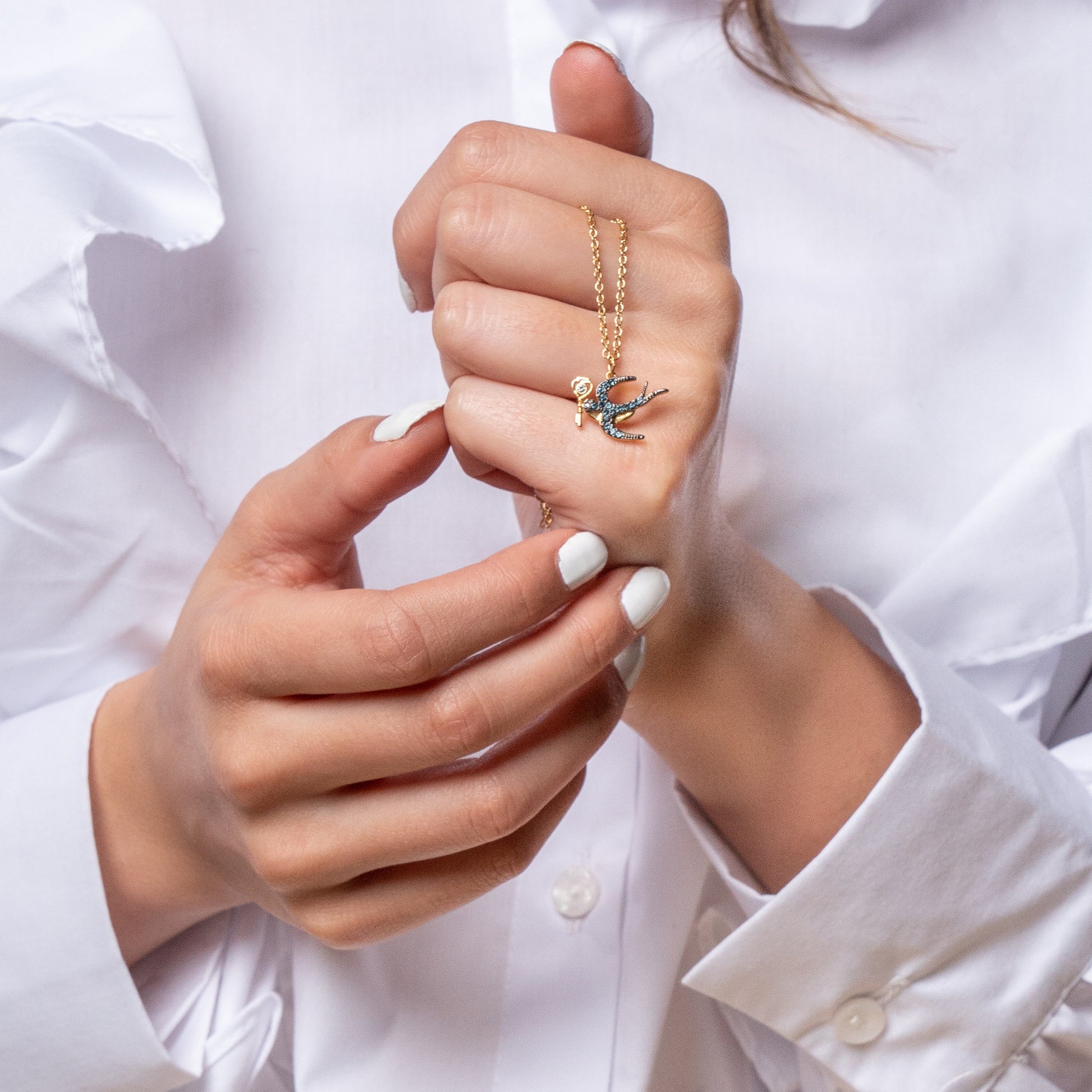 This must-have gold-tone plated necklace features a delicate pavé embellished crystal swallow, representing positivity and rebirth, and a lucky key motif. Elegantly shining with blue-colored crystals, it will add conversation-starting style to any outfit. Layer with other styles for an on-trend look.